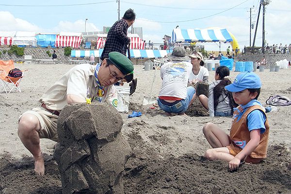 海岸で開催される「砂像教室」の当日運営スタッフは、昨年2名だった卒塾生参加者が今年は5名に増えたおかげで、多くのお子さんやご家族の砂像づくりをサポートすることができました。土台づくりを失敗する砂像が少なかったのも、その成果だと思います。