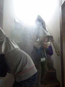 「前が見えない…。」 スモークマシンで煙を出して、煙の中の避難を体験しました。 |