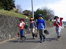 使う道具もみんなで運びます。 早く畑に行きたくて、思わず速足に。 |