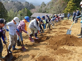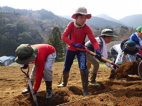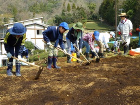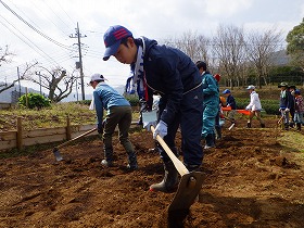 たい肥と腐葉土を入れたら、混ぜ込むため、クワで畑全体を耕します。 |