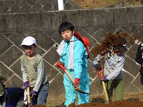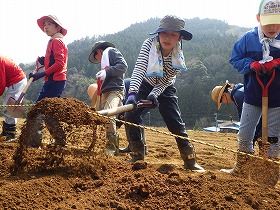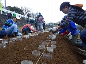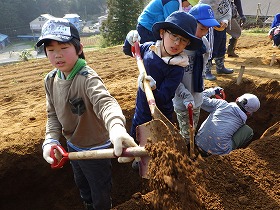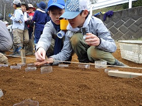 | いよいよ、お待ちかねのゴボウの種まきです。長くまっすぐなゴボウを収穫するため、深い穴を掘ります。みんなのやる気は充分!保護者の皆さんの力も借りて、どこまで掘れるか挑戦をしました。 | |