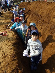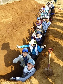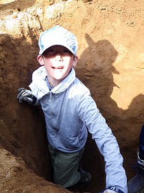 「140㎝掘れたよ!」 自分の体もすっぽり埋まるほどの深い穴が掘れました。 |