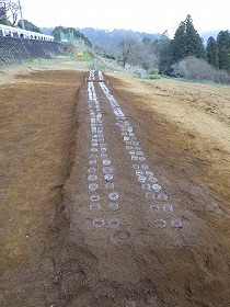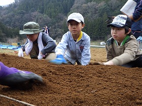 | 穴がなくなったら、ゴボウのベットとなる、畝(うね)を作ります。手で整えると、ふかふかの良い畝になりました。 | ![]() |