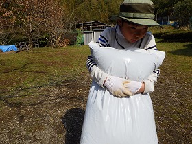 「重い…。」 30Lのたい肥が入っている袋を運びます。 |