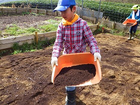 | 日曜日は、おいしい野菜作りのための第1歩となる、土作りをしました。生物がすみ、空気がよく入っている、ふかふかの土を目指します。 | |