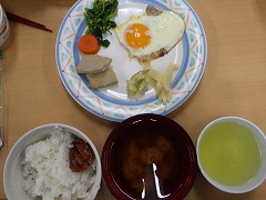 ・釜炊きご飯 ・味噌汁(味噌、キャベツ、タマネギ、ゴボウ) ・ベーコンエッグ(塾庭の桜の枝で燻したベーコン) ・人参の甘煮(人参) ・里芋の煮物(里芋) ・菜花のお浸し(菜花) ・漬物(たくあん) |