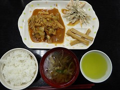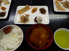 ・釜炊きご飯 ・中華スープ(タマネギ、人参、キャベツ、ネギ) ・回鍋肉(キャベツ、人参、味噌) ・ゴボウサラダ(ゴボウ、人参) ・手作りメンマ |