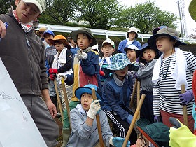 共同農園で行った作業を思い出し、苗を並べ、植えつけます。 |