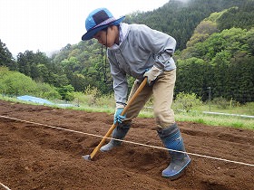 | 早速、畝たて作業。前回に比べぎこちなさが少なくなっているようです。 | ![]() |