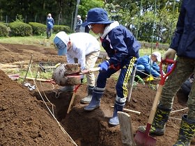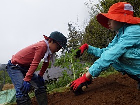 「だいぶ乾いたから、植え付けよう!」 お日様が畑を乾かしてくれて、ヤマイモを植え付けることに。長いヤマイモを作るために、土を深く耕しました。 |