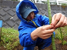 | 苗が倒れないように支柱に誘引(ゆういん)します。この時に作物が太くなることを予想して、余裕をもって輪を作ること、支柱からずり落ちないようにしっかり結ぶことが大切です。 | ![]() |