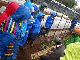 急に大粒の雨が降り始め、作業を一時中断。塾生たちが雨に濡れ、体調を崩さないように塾舎へ引き上げました。ここまでの作業、この後の作業を確認し、着替え、再集合。役割分担をして、引き続き植え付けを行う塾生、片付けと次の準備をする塾生に分かれました。 |