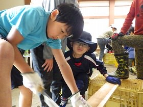 別れたメンバーは、道具の洗浄後、チーム農園の看板つくり。まずは材料の板を切るところから。 「おさえているから大丈夫だよ!」 「曲がってない??」 互いに協力しながら、看板の材料つくり。 |