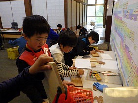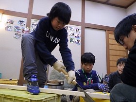 昼食をはさみ、看板つくりの続き。 地面にさしやすいように杭を斜めに切る作業。これがなかなか難しい。 しかし、チームの高学年が進んで取り組み、上手に切ります。さすが! |