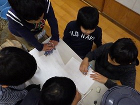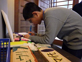 チームの名前を書く看板を下書き。休んでいる塾生のことを考え、本番は次回以降にするそうです。 |