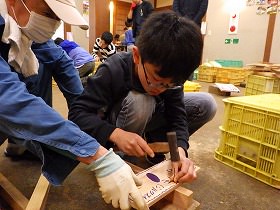 | 作った看板を畑に立てに行くチームもありました。 「交代で打とう!」 順番にチーム全員が木づちでたたきました。みんなの思いがこもり、無事に設置! |