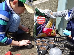 | 畑が水分を多く含んでいるために、ポットに種をまき、育苗に挑戦! 「あ、種を落とした!」 小さい種を見失わないように注意しないと! |
