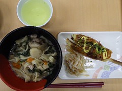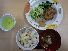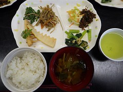 ・タケノコご飯(タケノコ、山椒) ・すまし汁(タケノコ、新タマネギ、ネギ、人参) ・キャベツメンチカツ(キャベツ、新タマネギ) ・サラダ(キャベツ、水菜、人参) ・里芋の煮物(里芋) ・小松菜の炒め物(小松菜) |
