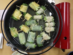 ・釜炊きご飯 ・味噌汁(味噌、新タマネギ、キャベツ、小松菜) ・水菜の肉巻き(水菜) ・水菜の油揚げ巻き(水菜) ・水菜の大根巻き(大根) ・手作りのりたま風 ・納豆(ネギ) |