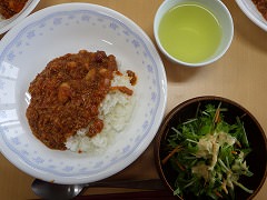 ・チリコンカン(タマネギ、人参) ・サラダ(水菜、新タマネギ、人参) |