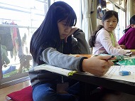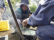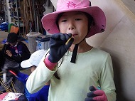 ヒョウタン加工: 「くさい!」ヒョウタン特有の臭さに負けじと、作業を頑張りました。 |