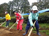 秋野菜の植え付け: 子供用のクワの中でも重たいクワを使って、うね立てを頑張った! |