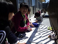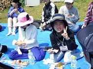 お花見ご飯: 桜の花を見ながら、塾庭でお昼ご飯。おいしさにピースサイン。 |