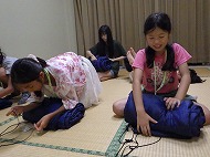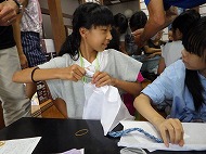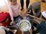 藍染(模様付け): 「どうしよう?」ビー玉や輪ゴムを使ってどんな模様にするか悩んだね。 |