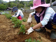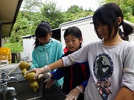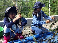 | ジャガイモの芽かき: 共同農園のジャガイモを大きく育てるために芽かきをしました。 |