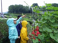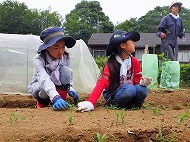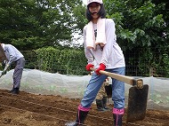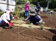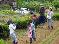 チーム農園作業: 「ビョンビョン面白い!」楽しいけど、枝豆にネットをかけようよ。 |