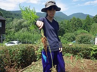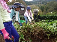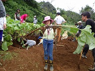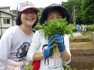 ゴボウの収穫: 前回お休みだった人は今ステージ収穫。やりきった笑顔が輝いてます~! |