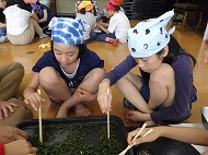 お茶作り: いい香り。 「味見していい??」すぐ、食べたがる…。 |