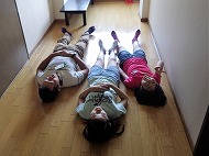 | 休み時間: 「涼しくて気持ちいい~。」…って。廊下の端で寝っ転がって休憩~。 |
