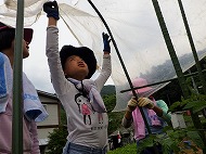 チーム農園作業: トマトに雨除け。 「ギリギリ届く!風で飛ぶ前にとめて!」 |