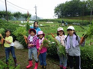 | チーム農園作業: 「ニンジン大好き!!」 間引きニンジンを手にニコニコ笑顔! |