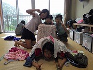 | 寝袋の準備: 「きれいに巻けたよ!」テントで使う寝袋の準備もわくわく。 |